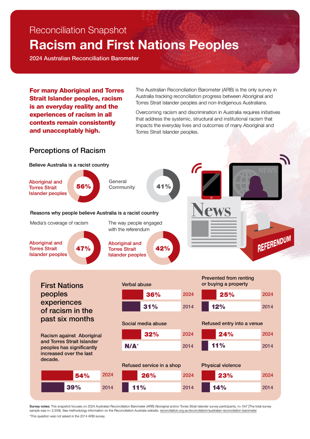 The Australian Reconciliation Barometer (ARB) is a national research study, undertaken every two years since 2008. It is the only survey in Australia that measures the progress of reconciliation between Aboriginal and Torres Strait Islander people and non-Indigenous Australians.