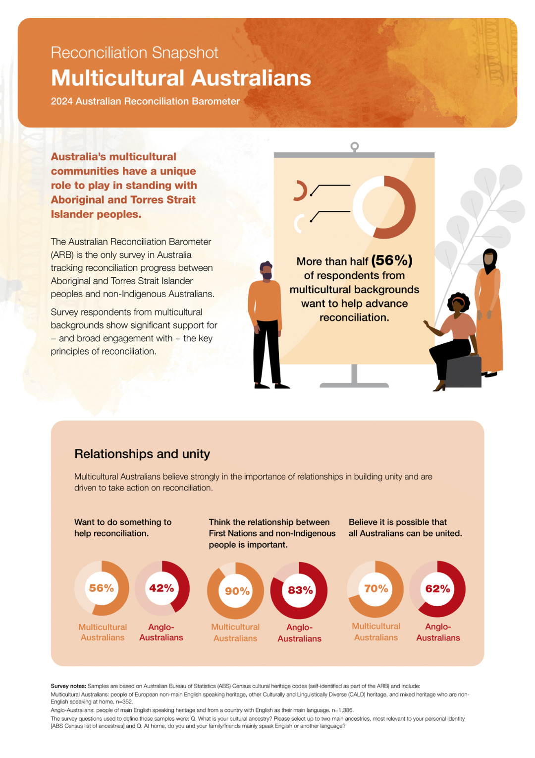 The 2024 ARB shows that multicultural Australians believe more strongly in the importance of relationships in building unity than mainstream Australians and are more driven to take action on reconciliation.