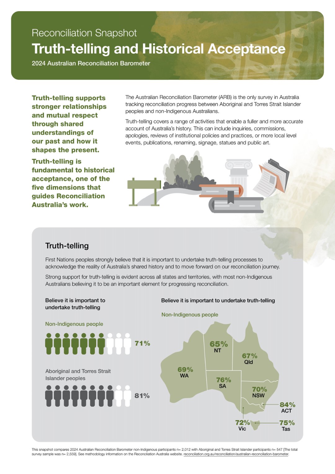 Most non-Indigenous Australians recognise the importance of truth-telling in advancing reconciliation but only some are participating in truth-telling opportunities. Younger non-Indigenous Australians show greater participation compared with the broader non-Indigenous community.
