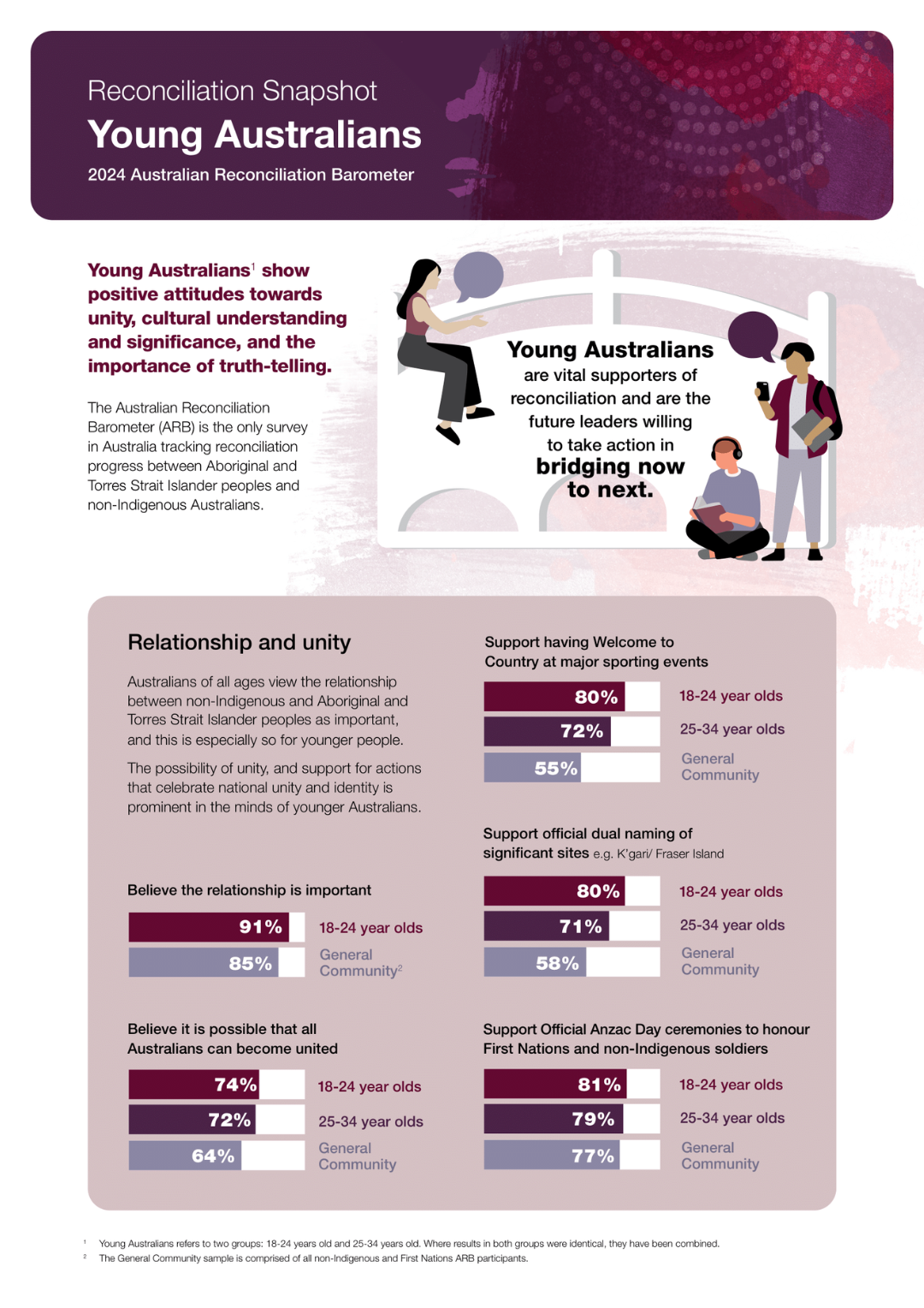 Young Australians aged 18 – 34 years old have more positive attitudes towards unity, cultural understanding and the importance of truth-telling than older Australians. They are the future leaders willing to take action in advancing reconciliation.