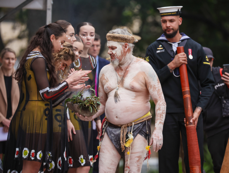 Despite the cold weather, 500 school children, veterans, servicepeople, and community members gathered on Gadigal Land at the Anzac Memorial to commemorate First Nations veterans. Held every NRW for the last 18 years, the commemoration service is supported by RSL NSW. Photo: Salty Dingo