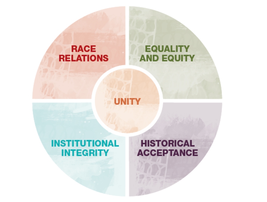 Our vision of reconciliation is based on five interrelated dimensions: race relations, equality and equity, institutional integrity, unity and historical acceptance.