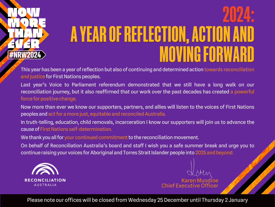 Reconciliation Australia acknowledges Traditional Owners of Country throughout Australia and recognises the continuing connection to lands, waters and communities. We pay our respect to Aboriginal and Torres Strait Islander cultures; and to Elders past and present.